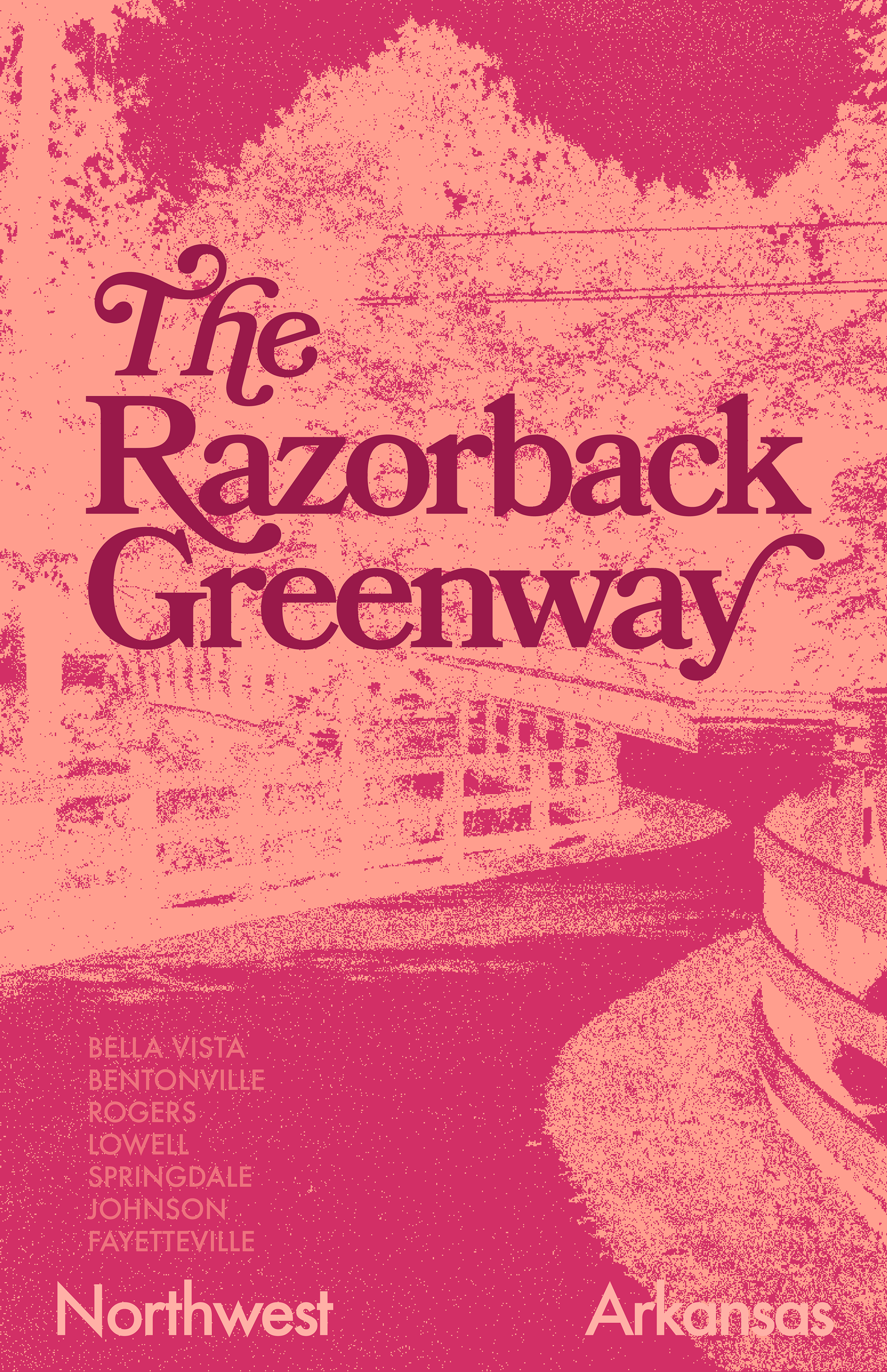 As a Northwest Arkansas native, I have seen how important and vital the Razorback Greenway is to the area. The 40 miles of trail from Bella Vista, through Bentonville, Rogers, Lowell, Springdale, Johnson, and ending in Fayetteville serves as the best and most enriching way to explore the area by bike or foot. Referencing vintage book covers, I created a design that alludes to the history of the area. I have always appreciated nostalgic and vintage design. Incorporating this “nostalgia” feeling into my poster invites viewers to feel comfortable and reminisce on the area as though they have been here before.